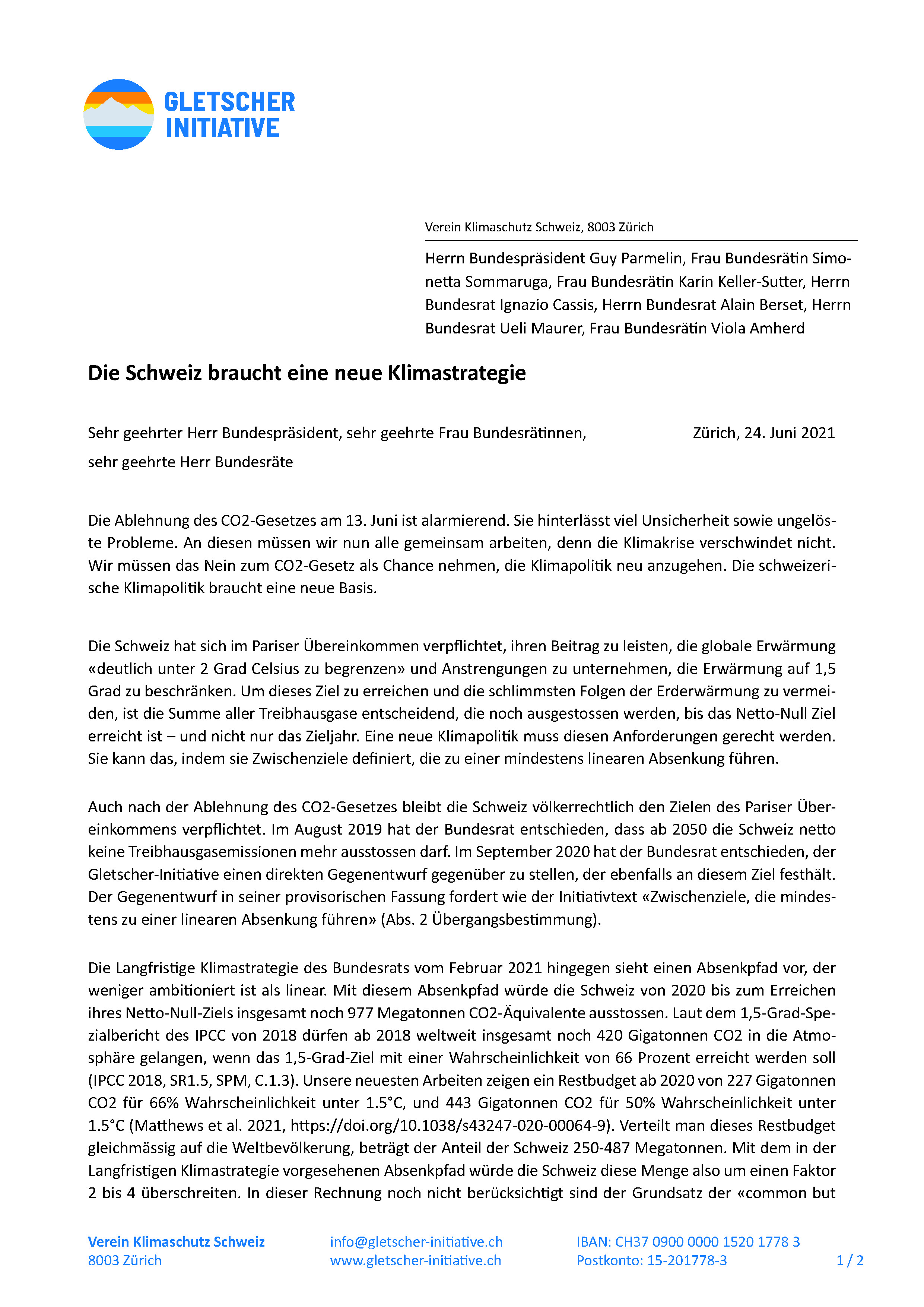 Der wissenschaftliche Beirat der Gletscher-Initiative bekräftigt in einem offenen Brief an den Bundesrat, dass es jetzt eine neue Grundlage für die Schweizer Klimapolitik braucht. Die Gletscher-Initiative ist das Minimum, was die Schweiz erreichen muss, um die Ziele des Pariser Klimaabkommen zu erfüllen und ihren Beitrag an die Begrenzung der globalen Erwärmung auf 1,5 Grad zu leisten. Deswegen fordert der wiss. Beirat die Annahme der Gletscher-Initiative durch den Bundesrat.