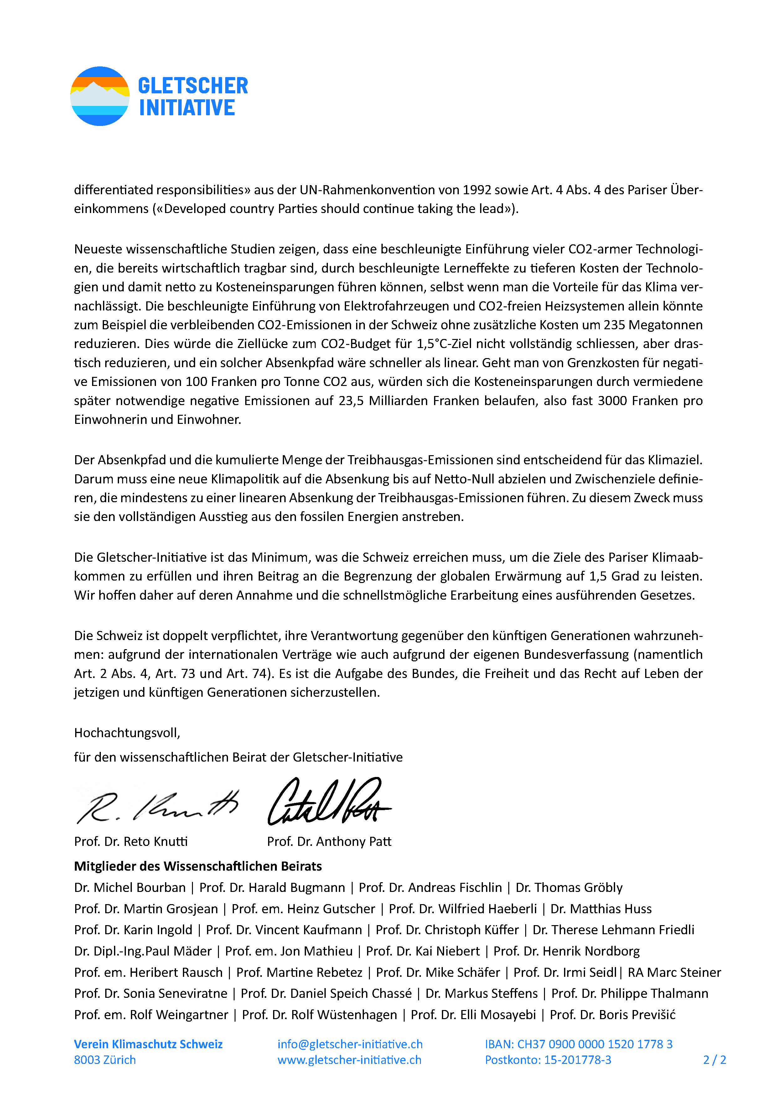 Offener Brief von Reto Knutti und Tony Patt im Namen des wiss. Beirats der Gletscher-Initiative (2/2)