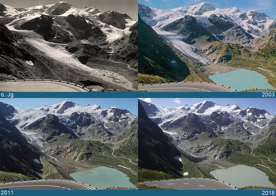 Bildvergleiche des Morteratschgletschers (Kt. GR) von 1911-2015 belegen eindrücklich dessen Schwund. Bildquelle: Sammlung Gesellschaft für ökologische Forschung.