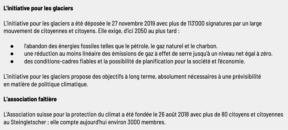 Le comité de l'initiative va maintenant examiner attentivement le contre-projet indirect à l'initiative pour les glaciers. Le contre-projet indirect doit être à la hauteur du contre-projet direct. Bien que le contre-projet direct n’interdise pas l’utilisation des énergies fossiles, il prévoit un engagement clair à long terme à n'autoriser la combustion de pétrole, de gaz naturel et de charbon que dans des cas exceptionnels. Pour les initiants et initiantes, il est impératif que cet engagement soit interprété de manière stricte. En effet, selon le rapport du GIEC, l'abandon des énergies fossiles est le moyen le plus adapté de lutter contre la crise climatique.